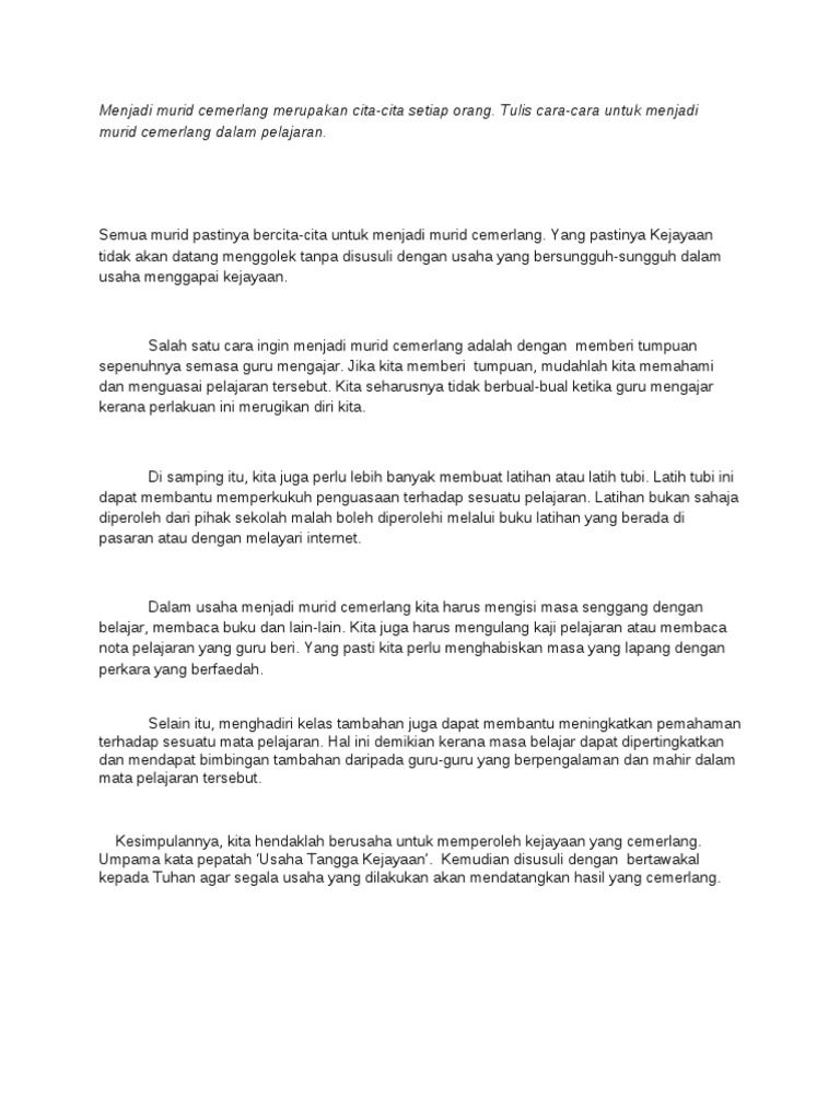 Cara cara menjadi murid cemerlang karangan. Memberi tumpuan semasa guru mengajar adalah cara yang baik diamalkan agar murid boleh cemerlang. Cara cara menjadi murid yang cemerlang dalam pelajaran setiap orang mahukan keputusan yang cemerlang dalam peperiksaan. Setiap orang mahukan keputusan yang cemerlang dalam peperiksaan. Cara cara menjadi murid yang cemerlang.