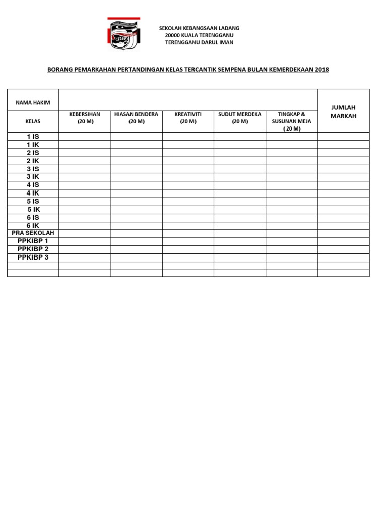 Borang Pemarkahan Pertandingan Kelas Tercantik Sempena Bulan Kemerdekaan 2018