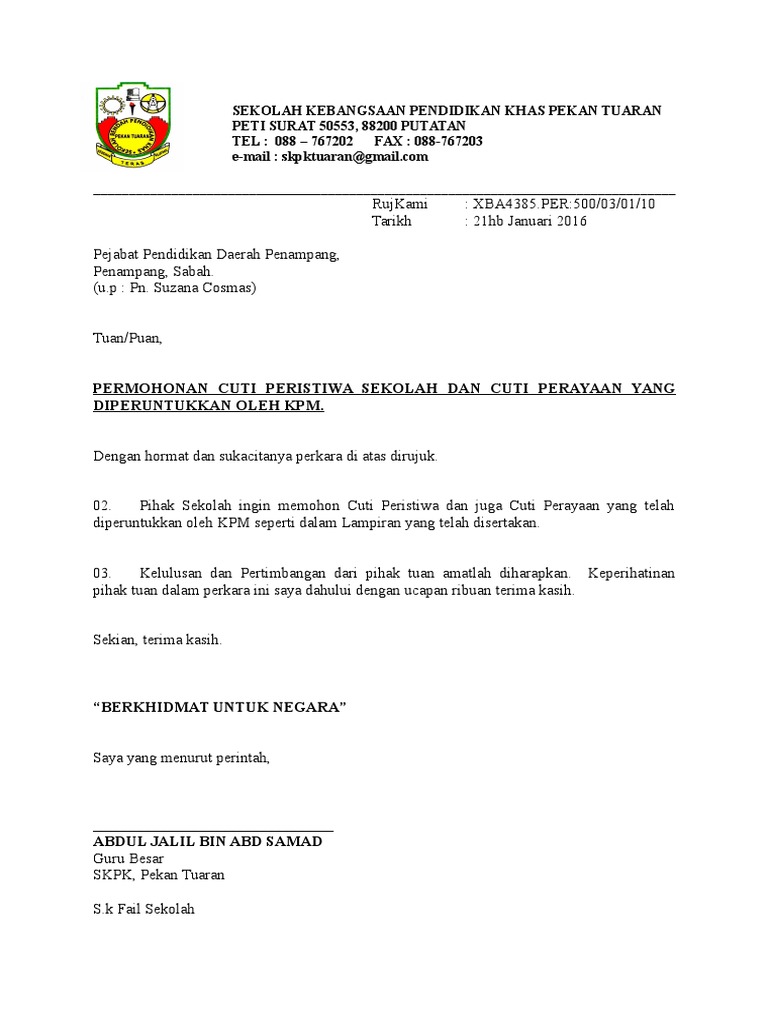 Surat Rasmi Mohon Cuti Raya Surat Rasmi N